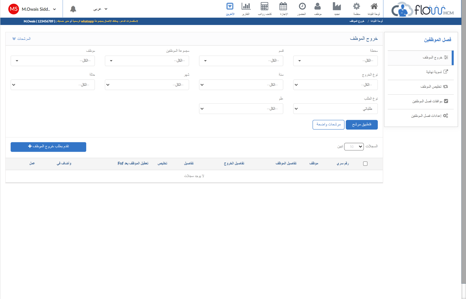 أصبحت عملية النهاية الخدمة الموظفين أو تقاعدهم أو إقالتهم سهلة وبسيطة مع التطبيق FlowHCM. يمكن للموظف إرسال رسالة استقالته، عند الموافقة تشمل هذه الوحدة البديهية الدورة الكاملة للخروج الشامل من خطاب القبول، مقابلة النهاية، وتخليص الموظف إلى التسوية الكاملة والنهائية.