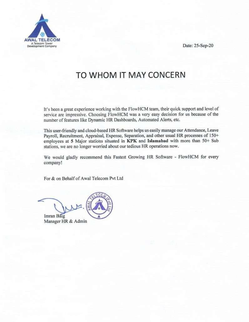 لقد كانت تجربة العمل مع فريق FlowHCM رائعة، ودعمهم السريع ومستوى خدمتهم مثير للإعجاب. كان اختيار FlowHCM قرارًا سهلاً للغاية بالنسبة لنا نظرًا لعدد الميزات مثل لوحات معلومات الموارد البشرية الديناميكية والتنبيهات الآلية وما إلى ذلك. برنامج الموارد البشرية هذا سهل الاستخدام والقائم على السحابة الإلكترونية و يساعدنا في إدارة الحضور، وتجهيز كشوف الرواتب، والتوظيف، والتقييم، والمصروفات، وفصل موظف من الخدمة، وعمليات الموارد البشرية المعتادة الأخرى لأكثر من ١٥٠+ موظف في ٥ محطات رئيسية تقع في خيبر بختون خواه وإسلام أباد مع أكثر من ٥٠+ المحطات الفرعية، لم نعد قلقين بشأن عمليات الموارد البشرية الشاقة لدينا الآن. نود أن نوصي بكل سرور ببرنامج الموارد البشرية الأسرع نموًا – FlowHCM لكل شركة!